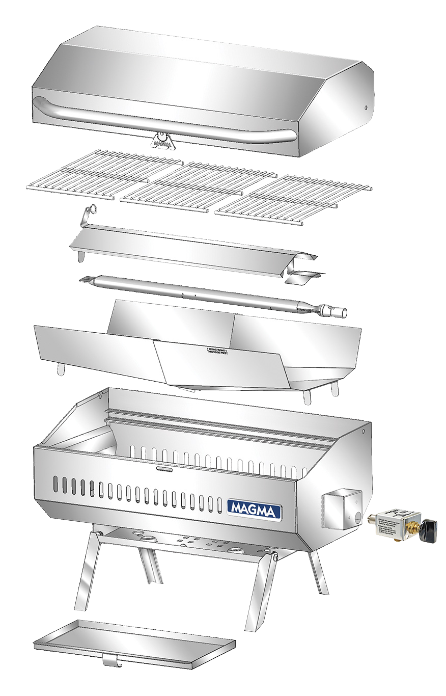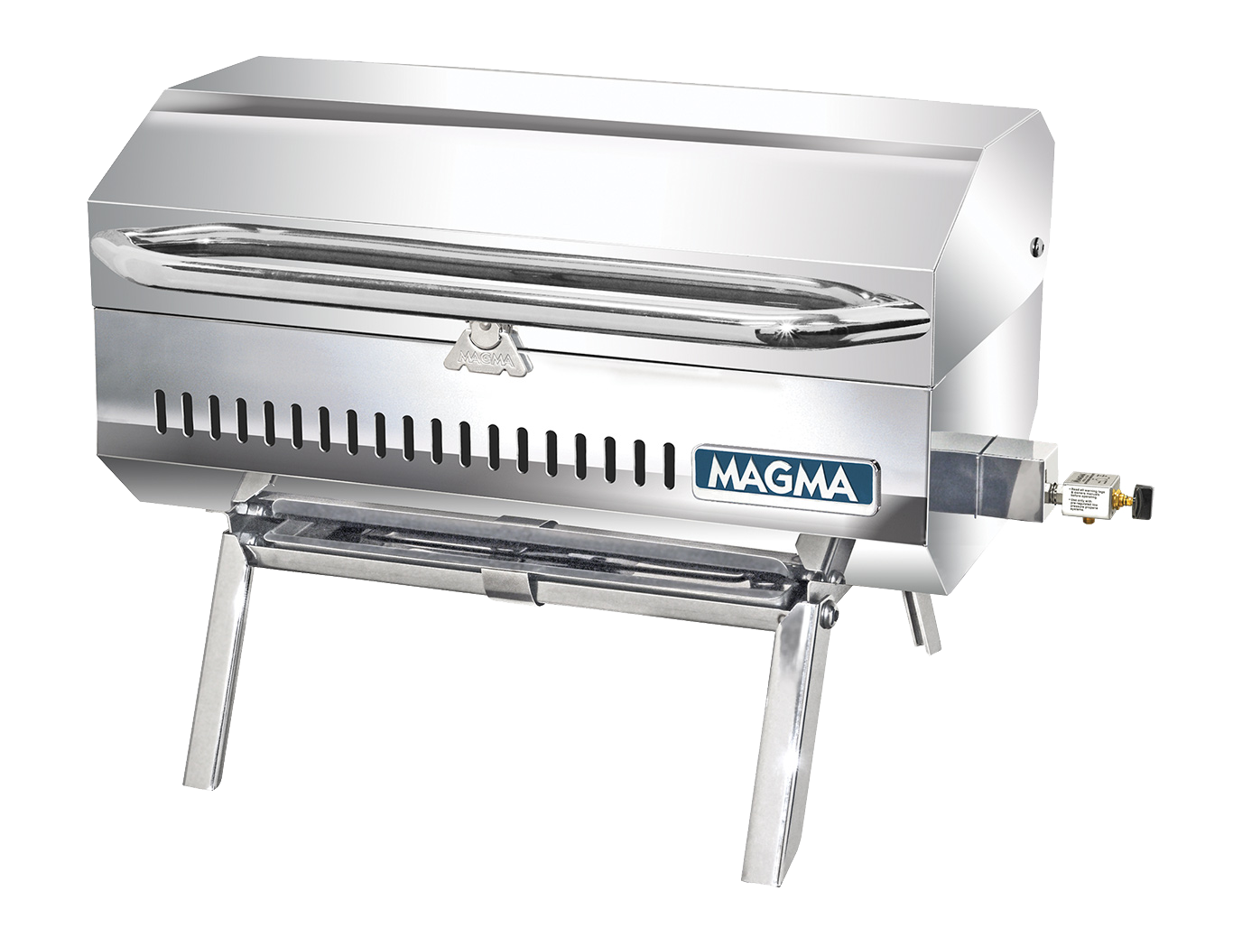 Meticulous attention to even the smallest details creates the finest value grill available. Wind tested for perfect even heat distribution, this grill offers the cooking performance usually only found in large back yard grills costing much more. Easily transported, the Fold-Away legs are out of the way on-board, but readily available for that quick picnic on shore. The Snap-out radiant plate provides easy access for clean up yet allows the flame kissed flavor that makes for really memorable meals on onboard or ashore. Designed for beauty and performance, youβll find that the ChefsMate is constructed flawlessly for years on dependable use. Its fuel efficient swiveling control valve, attaches to, pre regulated, low pressure propane (LPG) fuel systems or can be adapted for use with 1lb. disposable propane fuel canisters or natural gas (CNG) fuel systems.Β Magma offers the largest selectionΒ of mounting options (sold separately) to customize the grill for your needs. Serving tray not included.