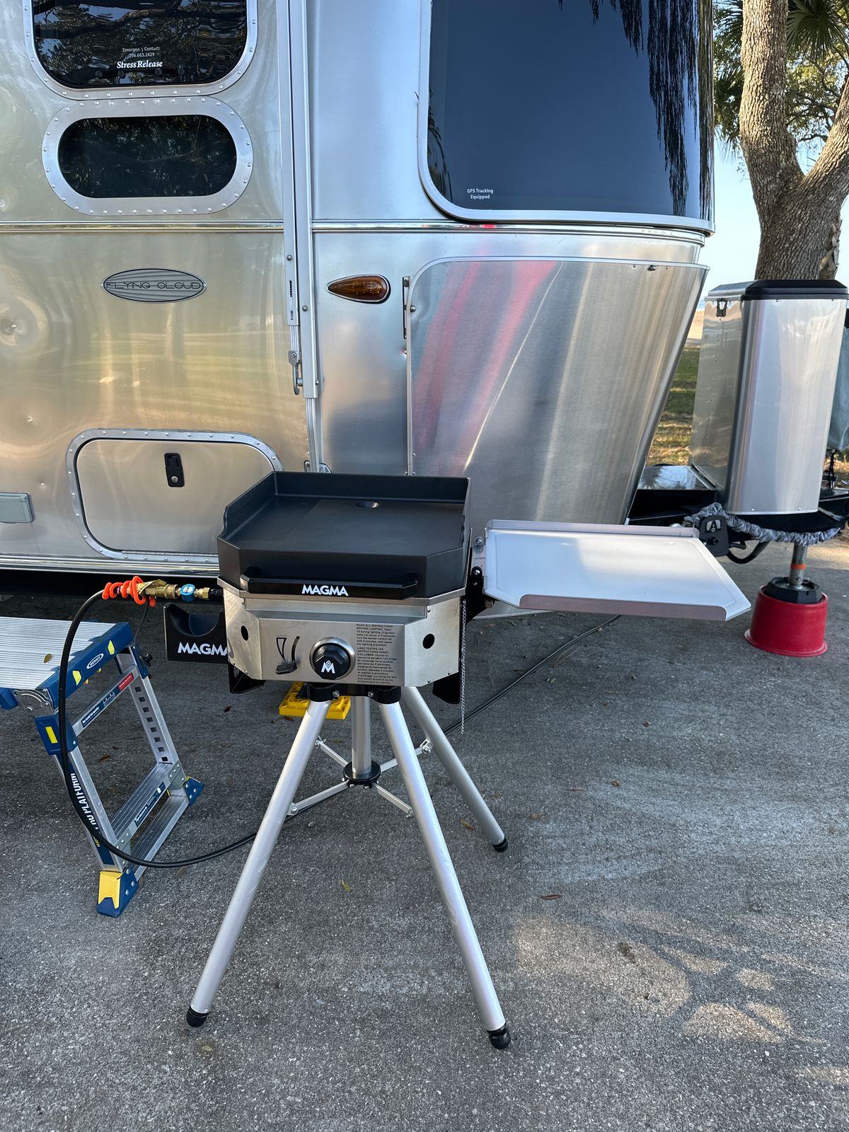 Build your perfect outdoor kitchen cooking experience with Magma's Crossover series portable, modular cook system.Β Β It starts with the brushed 304Β stainless steel Single Firebox. This Firebox features a 15,000 BTU burner with a built in wind deflector, to maintain a strong and efficient flame in any condition.Β A fold-out food preparation shelf with an FDA approved cutting board insert, that can be easily removed for cleaning.Β This side shelf doubles as the lid when the Firebox is not in use and secures with a latch for easy transport.Β All handles and controls are made from durable, heat resistant thermoplastic.Β The front control panel includes and innovativeΒ altitude adjustment system that ensures the flame stays consistent at different elevations.Β Use as a stove out of the box, placing any pot or saute pan on the cooking grate. It includes a cradle to hold aΒ 1-lb disposable propane cylinder at a 35 degree angle, for the most efficient use of the propane.Β Or add any of the optional toppers to grill, make pizza, or griddle.Β When using these toppers, the Firebox collects any excess grease in the back through a unique grease containment system, ensuring your area remains clean.Β Β Let Magma help you create magnificent meals from morning to night when you're out on an adventure in your RV or tailgating with your best buds. Comes with table top legs or mount to the Magma Quad Pod or Trailer Hitch Mount (mounts sold separately).
