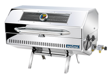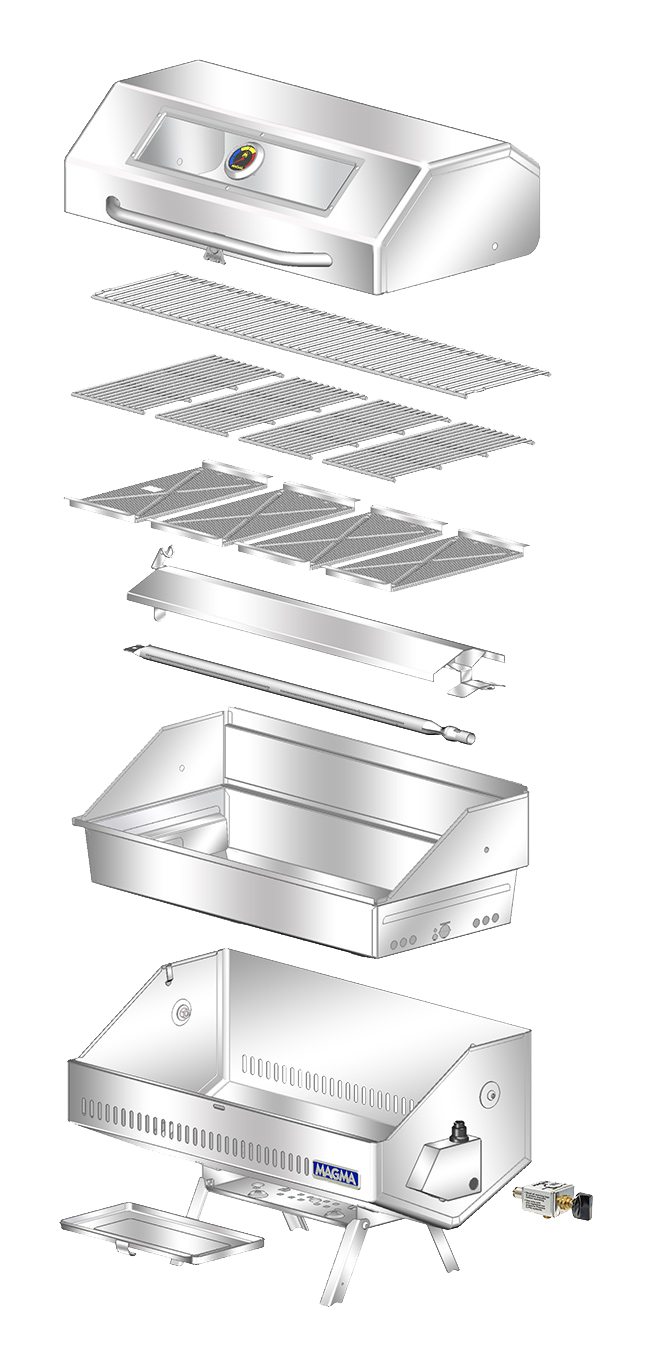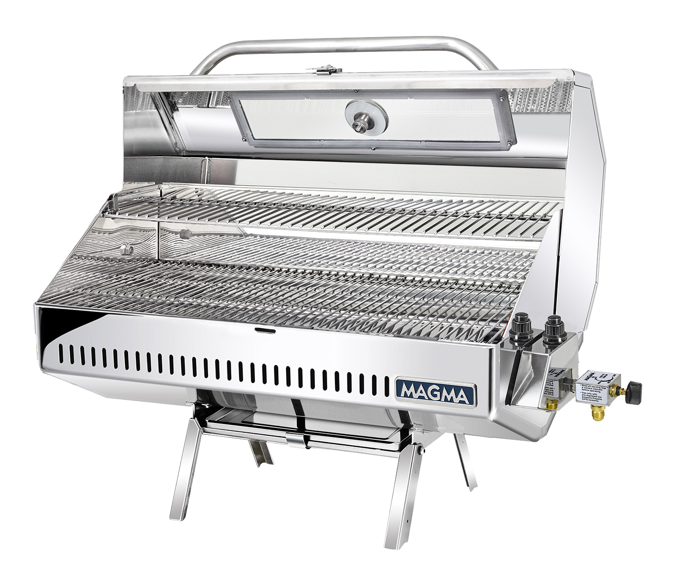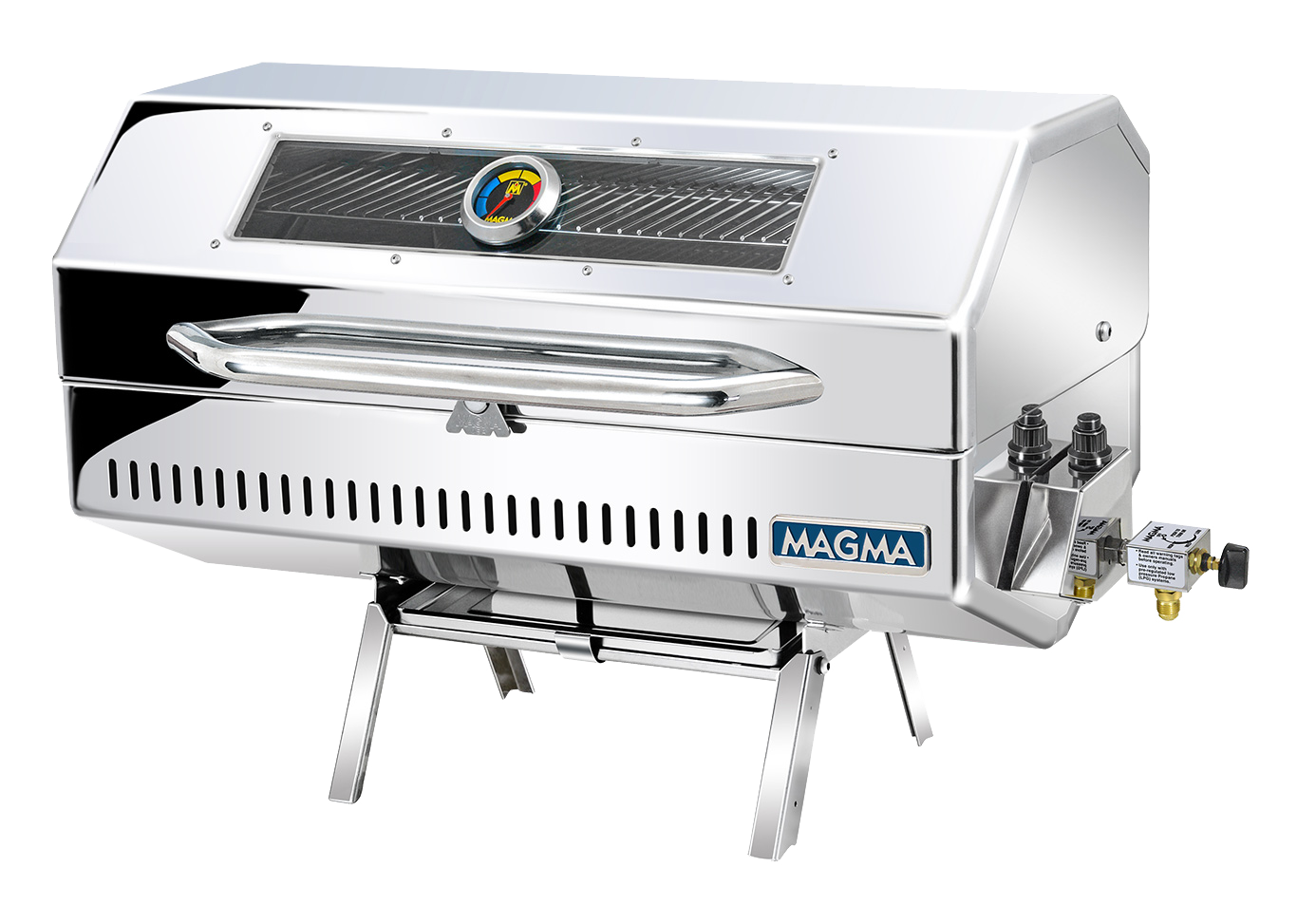 Perfect your grilling skills with Magma's completely redesigned Monterey II Infrared Gas Grill. The perfect addition for feeding a large crew, this versatile, portable, finely crafted grill is always ready for action. New features include: an elegant exterior design, a completely redesigned combustion system that keeps the grill lit even in heavy winds, a hermetically sealed thermometer, a dependable electronic ignition system, powered by a single βAAAβ battery (included), and an ultra high-temp glass viewing window. Anti-Flare Infrared technology produces intense, evenly distributed heat, eliminating Flare-Up and immediately emulsifies drippings giving your meal a great smoky flavor. The primary and secondary grilling surfaces give you the option of searing, slow cooking, or warming. Constructed entirely of 304 mirror-polished stainless steel to withstand even the harshest environments. Equipped with fold-away table top legs for go-anywhere use. Its fuel efficient swiveling control valve, attaches to, pre regulated, low pressure propane (LPG) fuel systems or can be adapted for use with 1lb. disposable propane fuel canisters or natural gas (CNG) fuel systems. Magma offers the largest selectionΒ of mounting options (sold separately) to customize the grill for your needs.Β Β Heavy Duty mounting hardware is recommended.Β Serving tray not included.