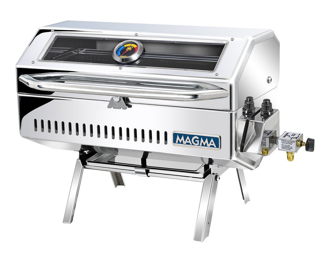 Magma's completely redesigned Newport II Infrared Gas Grill is a perfect addition for that perfect day on the water. New features include: an elegant exterior design, a completely redesigned combustion system that keeps the grill lit even in heavy winds, a hermetically sealed thermometer, a dependable electronic ignition system, powered by a single βAAAβ battery (included), and an ultra high-temp glass viewing window. Anti-Flare Infrared technology produces intense, evenly distributed heat, eliminating Flare-Up and immediately emulsifies drippings giving your meal a great smoky flavor. Constructed entirely of 304 mirror-polished stainless steel to withstand even the harshest environments. Equipped with fold-away table top legs for go-anywhere use. Its fuel efficient swiveling control valve, attaches to pre regulated, low pressure propane (LPG) fuel systems or can be adapted for use with 1lb. disposable propane fuel canisters or natural gas (CNG) fuel systems. Magma offers the largest selectionΒ of mounting options (sold separately) to customize the grill for your needs.Β Β Serving tray not included.