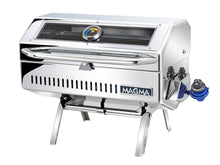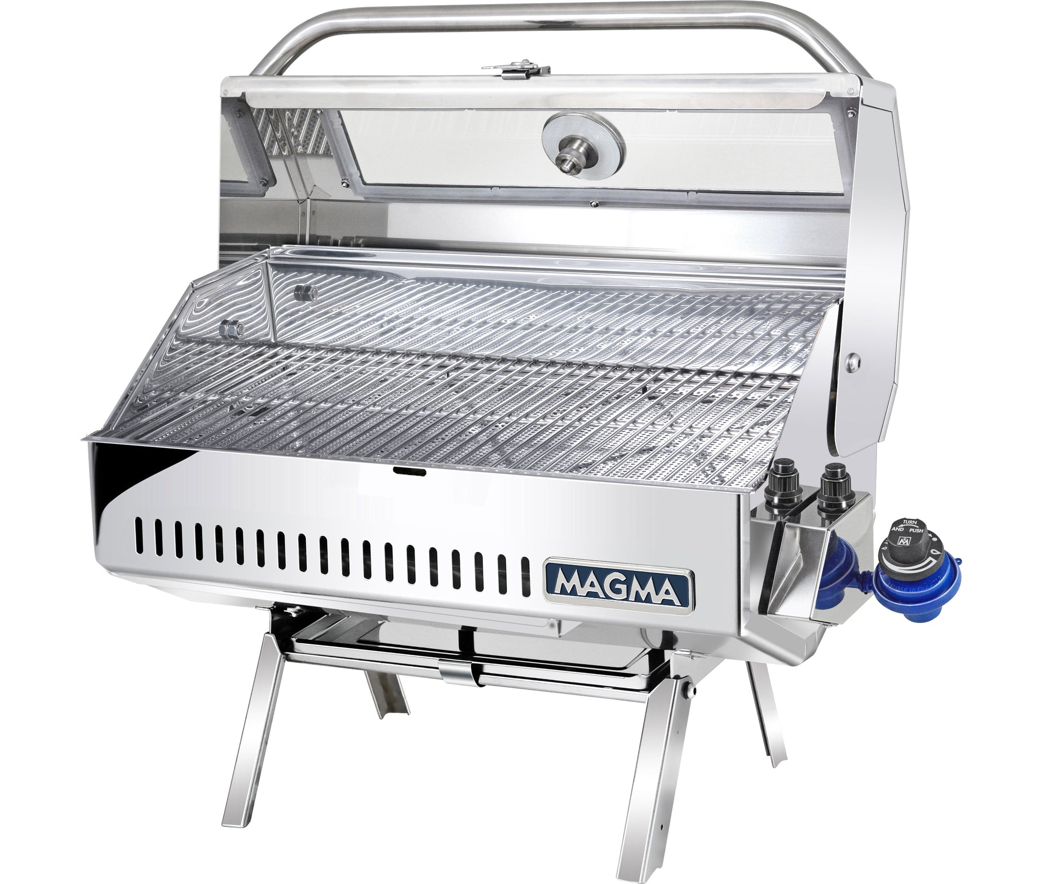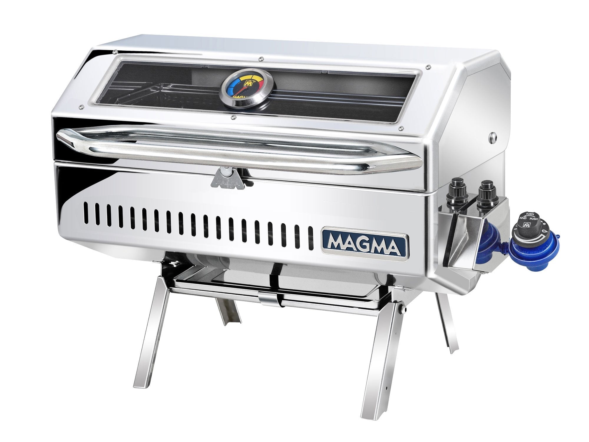 Magma's completely redesigned Newport II Infrared Gas Grill is a perfect addition for that perfect day on the water. This CSA (Canadian Standards Association) approved grill features include: an elegant exterior design, a completely redesigned combustion system that keeps the grill lit even in heavy winds, a hermetically sealed thermometer, a dependable electronic ignition system, powered by a single βAAAβ battery (included), and an ultra high-temp glass viewing window. Anti-Flare Infrared technology produces intense, evenly distributed heat, eliminating Flare-Up and immediately emulsifies drippings giving your meal a great smoky flavor. Constructed entirely of 304 mirror-polished stainless steel to withstand even the harshest environments. Equipped with fold-away table top legs for go-anywhere use. The swiveling control valve/regulator, designed to use 1lb. disposable propane fuel canisters, allows for quick, safe fuel canister exchanges or easily adapt grill to existing on-board low pressure propane (LPG) or natural gas (CNG) fuel systems. Magma offers the largest selectionΒ of mounting options (sold separately) to customize the grill for your needs.Β Β Serving tray and fuel canister not included.