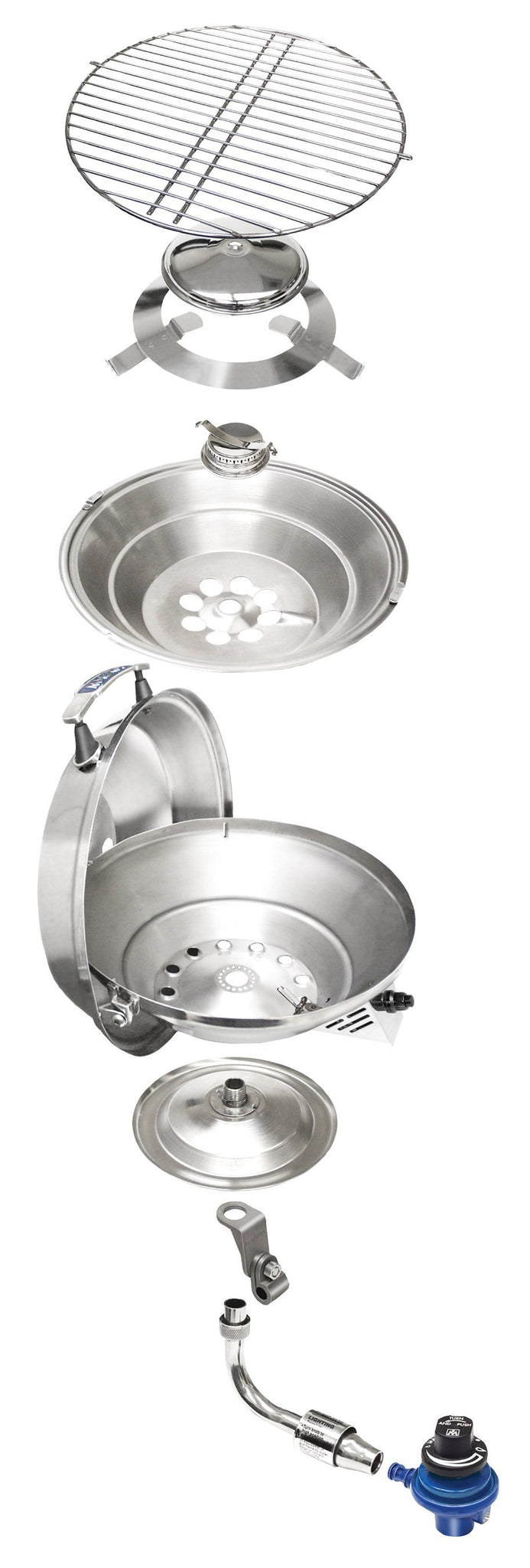 Enhance your grilling experience with Magma’s Marine Kettle 3 Combination Stove and Gas Grill. This CSA (Canadian Standards Association) approved, versatile, portable grill includes features that are both useful and user friendly including an electronic ignition system, powered by a single “AAA” Alkaline battery (included), a heavy-duty inner safety shell that keeps the outside of the grill cooler, guards against discoloration, while adding years of life to the grill. Made of the mirror polished, 304 marine-grade stainless exterior finish provides superior corrosion resistance, in even the harshest environments. Dependable, even in a stiff breeze, due to a virtual blow-out proof turbo venturi tube design, patented heat distribution system and burner, which directs more heat to the cooking surface. The swiveling control valve / regulator is designed to connect to 1lb. disposable propane fuel canisters and allows for quick, safe canister exchanges. Grill can also be easily adapted to any existing on-board LPG (propane) or CNG (natural gas) fuel system. Additional features include a balanced hinged lid that won't slam shut as the boat rolls, polished, 18-8 Stainless Steel "Stay Cool" handle with air cooled supports, and Stainless Steel L-bracket and clamp assembly to provide easier, more positive level mounting. These new features combined with Magma's patented radiant plate and dome system, make this the only boat grill that is truly a grill, stove, or oven -- a great advantage to boats without a galley, or if the crew just wants to cook outdoors. Magma offers the largest selection of mounting options (sold separately) to customize the grill for your needs. Fuel canister not included.