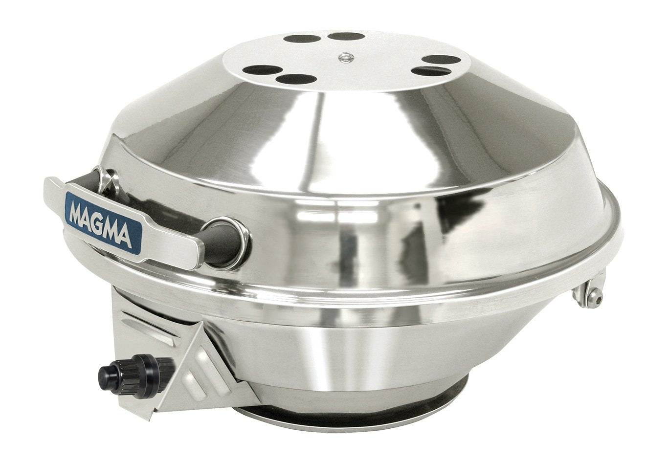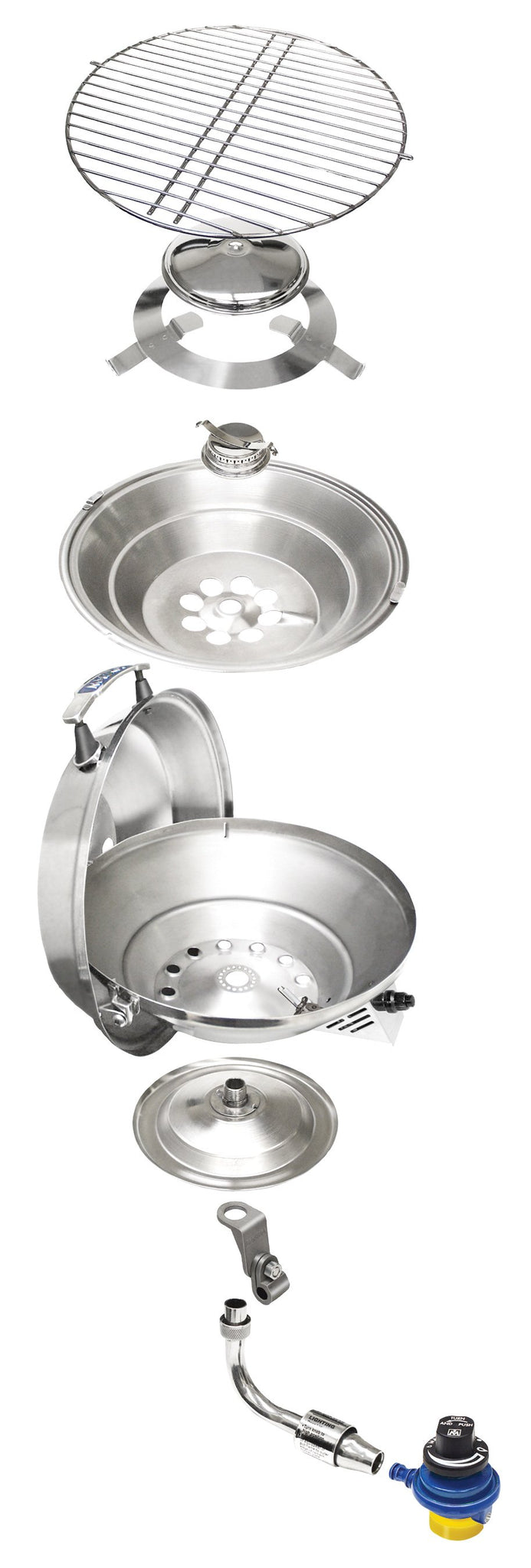 Enhance your grilling experience with Magma’s Marine Kettle 3 Combination Stove and Gas Grill. This versatile, portable grill includes features that are both useful and user friendly including an electronic ignition system, powered by a single “AAA” Alkaline battery (included), a heavy-duty inner safety shell that keeps the outside of the grill cooler, guards against discoloration, while adding years of life to the grill. Made of mirror polished, 304 marine-grade stainless exterior finish provides superior corrosion resistance, in even the harshest environments. Dependable, even in a stiff breeze, due to a virtual blow-out proof turbo venturi tube design, patented heat distribution system and burner, which directs more heat to the cooking surface. The swiveling control valve / regulator is designed to use standard disposable propane/butane mix Camping Gaz (CV270, CV270 Plus, CV470, or CV470 Plus) fuel canisters, allows for quick, safe fuel canister exchanges or easily adapt grill to existing on-board low pressure propane/butane or natural gas (CNG) fuel systems. Additional features include a balanced hinged lid that won't slam shut as the boat rolls, polished, 18-9 Stainless Steel "Stay Cool" handle with air cooled supports, and Stainless Steel L-bracket and clamp assembly to provide easier, more positive level mounting. These new features combined with Magma's patented radiant plate and dome system, make this the only boat grill that is truly a grill, stove, or oven -- a great advantage to boats without a galley, or if the crew just wants to cook outdoors. Magma offers the largest selection of mounting options (sold separately) to customize the grill for your needs. Fuel canister not included.