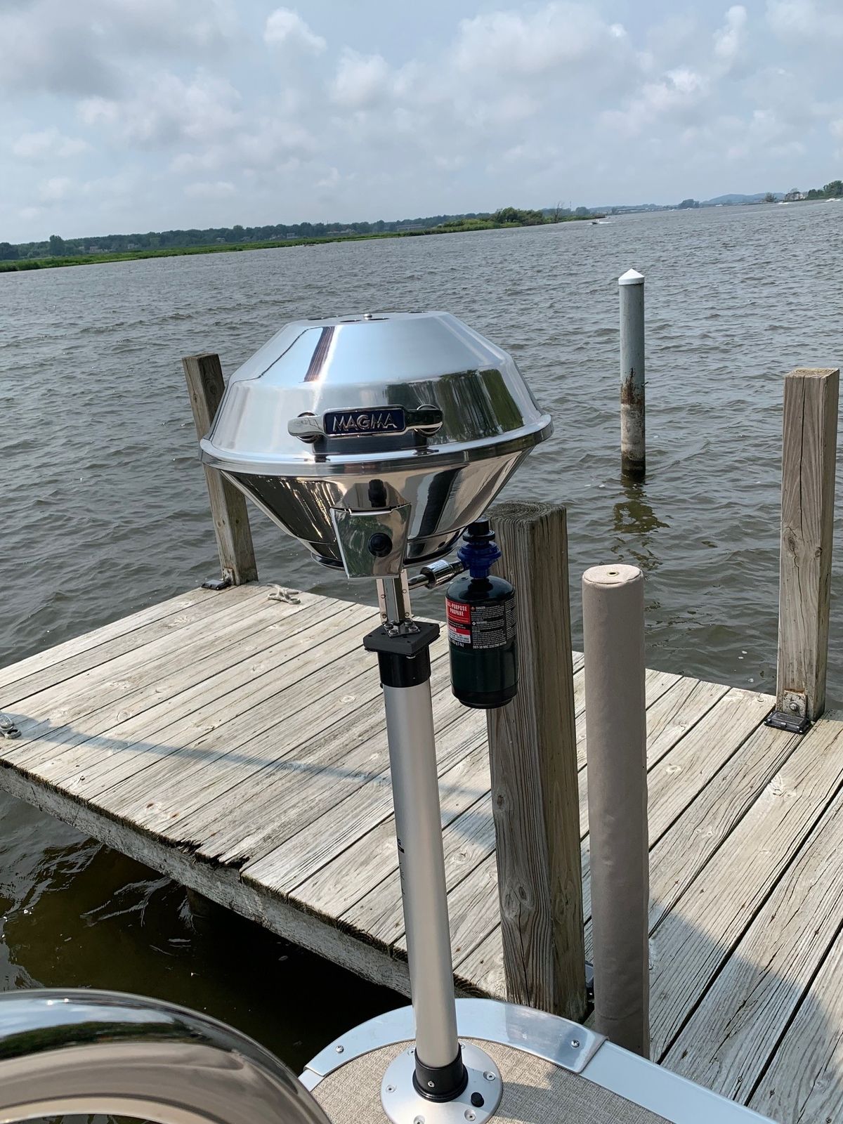Enhance your grilling experience with Magma’s Marine Kettle 3 Combination Stove and Gas Grill. This versatile, portable grill includes features that are both useful and user friendly including an electronic ignition system, powered by a single “AAA” Alkaline battery (included), a heavy-duty inner safety shell that keeps the outside of the grill cooler, guards against discoloration, while adding years of life to the grill. Made of mirror polished, 304 marine-grade stainless exterior finish provides superior corrosion resistance, in even the harshest environments. Dependable, even in a stiff breeze, due to a virtual blow-out proof turbo venturi tube design, patented heat distribution system and burner, which directs more heat to the cooking surface. The swiveling control valve / regulator is designed to connect to 1lb. disposable propane fuel canisters and allows for quick, safe canister exchanges. Grill can also be easily adapted to any existing on-board LPG (propane) or CNG (natural gas) fuel system. Additional features include a balanced hinged lid that won't slam shut as the boat rolls, polished, 18-9 Stainless Steel "Stay Cool" handle with air cooled supports, and Stainless Steel L-bracket and clamp assembly to provide easier, more positive level mounting. These new features combined with Magma's patented radiant plate and dome system, make this the only boat grill that is truly a grill, stove, or oven -- a great advantage to boats without a galley, or if the crew just wants to cook outdoors. Magma offers the largest selection of mounting options (sold separately) to customize the grill for your needs. Fuel canister not included.