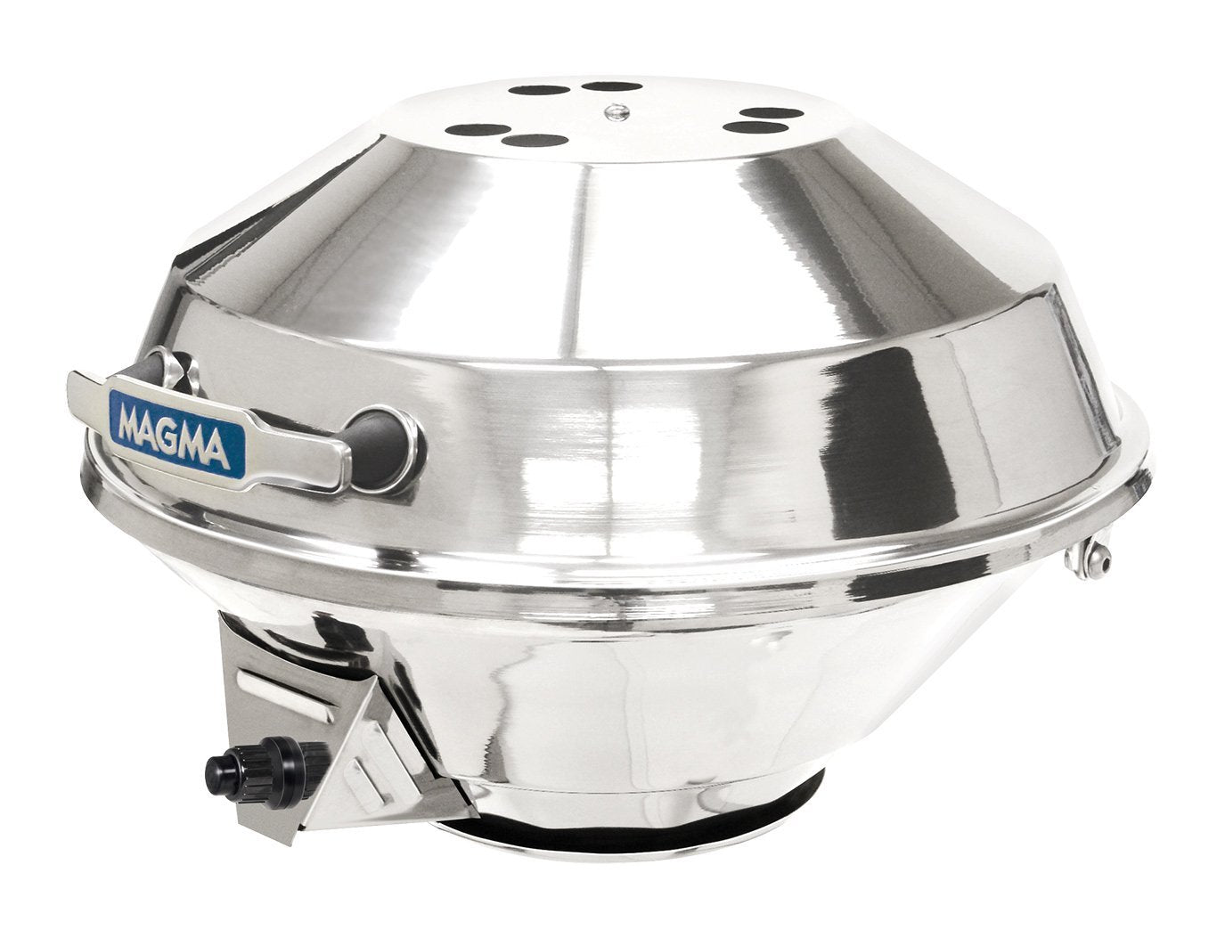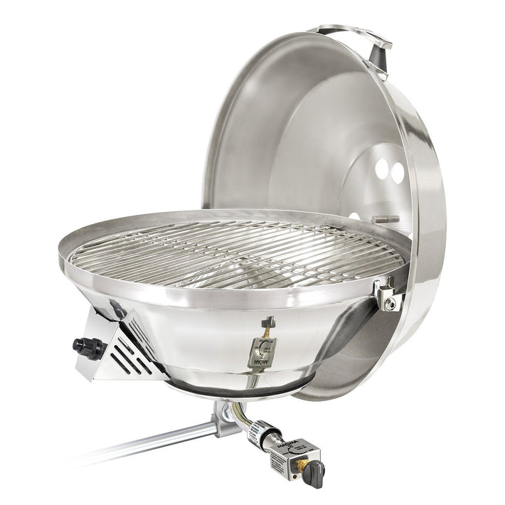 Enhance your grilling experience with Magma’s Marine Kettle 3 Combination Stove and Gas Grill. This versatile, portable grill includes features that are both useful and user friendly including an electronic ignition system, powered by a single “AAA” Alkaline battery (included), a heavy-duty inner safety shell that keeps the outside of the grill cooler, guards against discoloration, while adding years of life to the grill. Made of mirror polished, 304 marine-grade stainless exterior finish provides superior corrosion resistance, in even the harshest environments. Dependable, even in a stiff breeze, due to a virtual blow-out proof turbo venturi tube design, patented heat distribution system and burner, which directs more heat to the cooking surface. The swiveling control valve / regulator is designed to connect to 1lb. disposable propane fuel canisters and allows for quick, safe canister exchanges. Grill can also be easily adapted to any existing on-board LPG (propane) or CNG (natural gas) fuel system. Additional features include a balanced hinged lid that won't slam shut as the boat rolls, polished, 18-8 Stainless Steel "Stay Cool" handle with air cooled supports, and Stainless Steel L-bracket and clamp assembly to provide easier, more positive level mounting. These new features combined with Magma's patented radiant plate and dome system, make this the only boat grill that is truly a grill, stove, or oven -- a great advantage to boats without a galley, or if the crew just wants to cook outdoors. Magma offers the largest selection of mounting options (sold separately) to customize the grill for your needs.