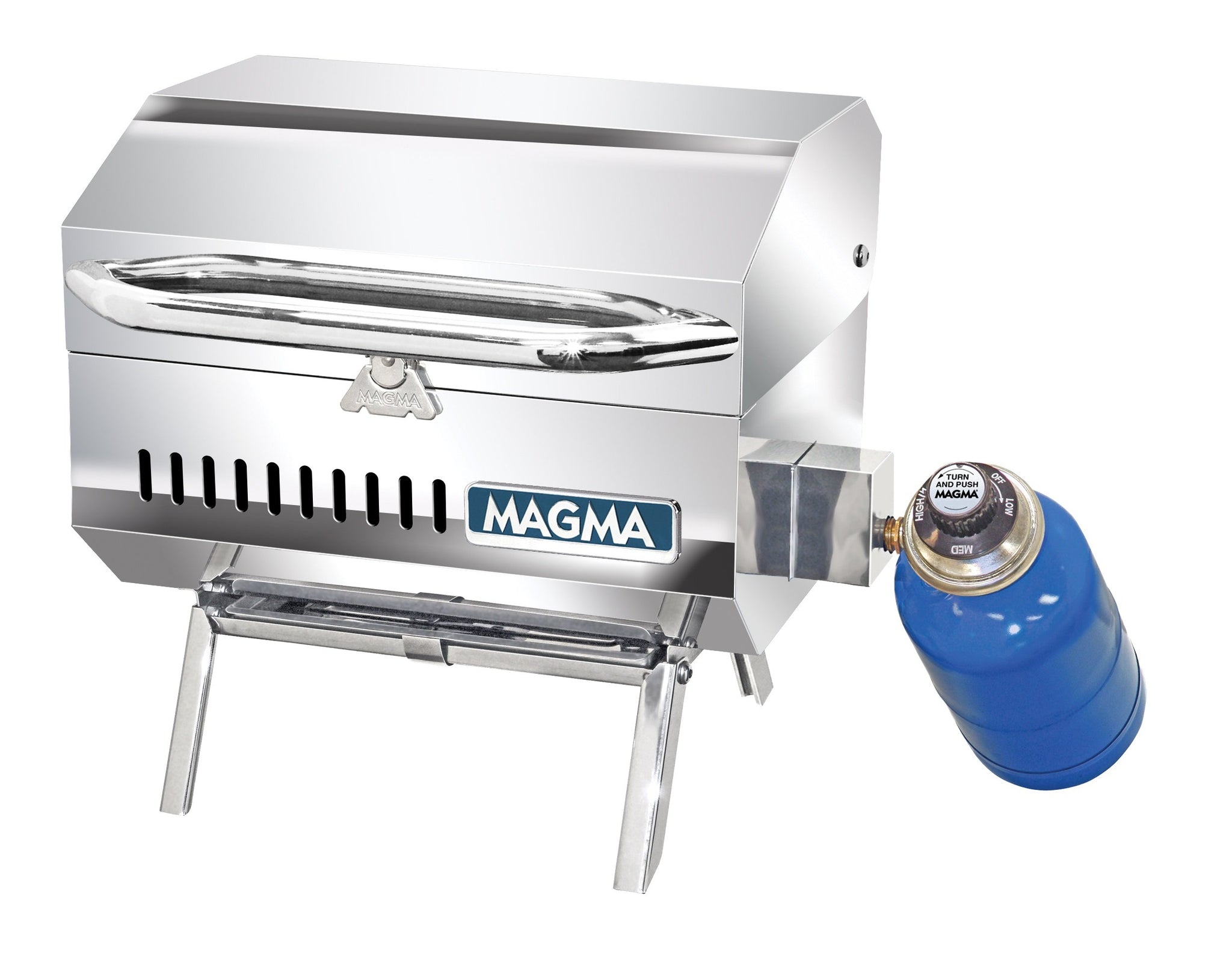 The compact TrailMate is perfect for any small crew or gathering. With its fold-away legs this grill has the go-anywhere capability to enhance your outdoor activities on-board or on-shore. Engineered to the same quality standard as our larger grills yet priced for the boater who doesnβt want to substitute quality for cost. This CSA (Canadian Standards Association) approved, 9β x 12β grill has 108 Sq. In. of grilling area, is constructed entirely of 304 mirror polished marine grade stainless steel, and is wind tested for even heat distribution for years of dependable service. The swiveling control valve/regulator, designed to use 1lb. disposable propane fuel canisters, allows for quick, safe fuel canister exchanges or easily adapt grill to existing on-board low pressure propane (LPG) or natural gas (CNG) fuel systems. Model uses single mount mounting hardware only. Magma offers the largest selectionΒ of mounting options (sold separately) to customize the grill for your needs.Β Β Fuel canister and serving tray not included.